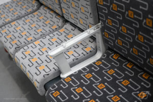 Working in harmony with the Rail division, Transcal Engineering created and trimmed 1,970 seats, each with an underslung USB and 3-pin socket, a meal tray, and reading light in the seat back – in LUMO Blue.